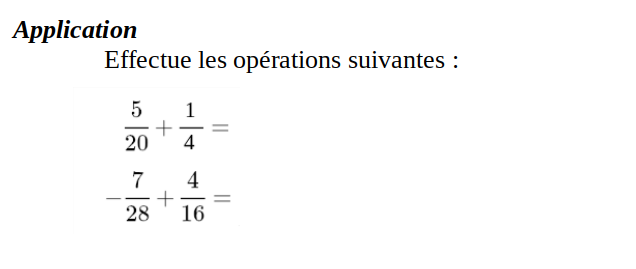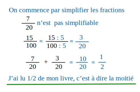 - Exemple : lundi j'ai lu 7/20 de mon livre et mercredi 15/100, quelle fraction de mon livre ai-je lu ?