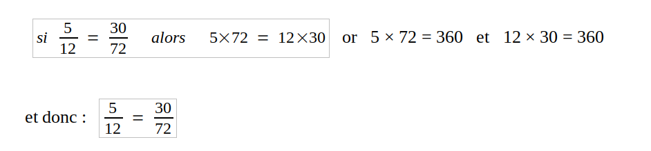 Exemple : vérification que 5/12 est bien égal à 30/72 :