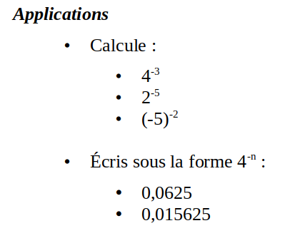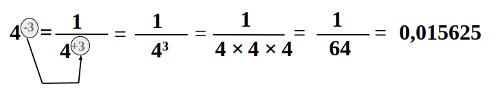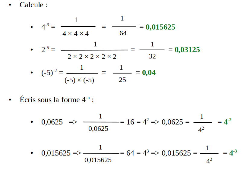 Un nombre A (différent de zéro) élevé à une puissance négative -n est égal au quotient de 1 par A élevé à la puissance +n