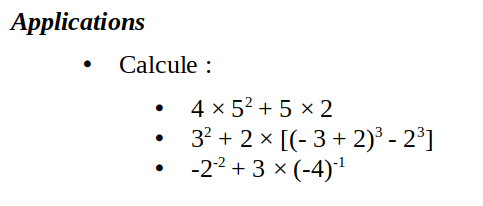 - D'abord les calculs entre parenthèses, en commençant par les parenthèses les plus intérieures