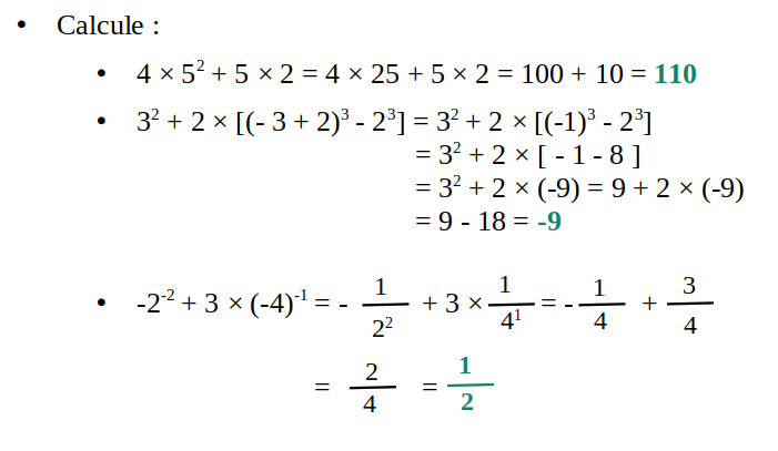 - Puis les puissances : 32 = 9 ; 2-2 = 1/22 = 1/4 et 13 = 1