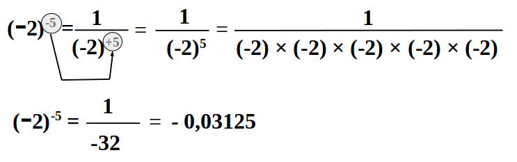 On vérifie : (-2)5 = -32 ; (-2)-5 = -0,03125 et - 0,03125 x (-32) = 1