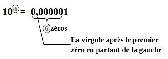 Pour élever 10 à une puissance entière négative, il suffit d'écrire autant de zéros que l'indique la puissance puis le chiffre 1,