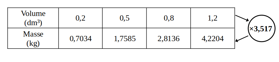 Si deux séries de nombres sont proportionnelles, le coefficient multiplicateur qui permet de passer de l'une à l'autre est appeléDans l'exemple suivant le coefficient de proportionnalité vaut 3,517, il s'agit de la masse volumique du diamant : 3,517 kg/dm3