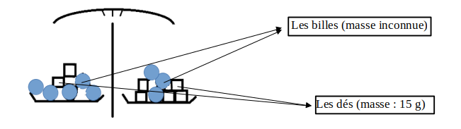 5 billes et 2 dés pèsent autant que 3 billes et 5 désTraduire cet équilibre par une égalité dans laquelle apparaîtront mb masse d'une bille