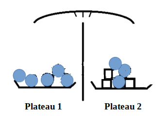 Plateau 1 : 5 billes et 2 désLes deux plateaux de la balance sont à l’équilibre, ce qui signifie :