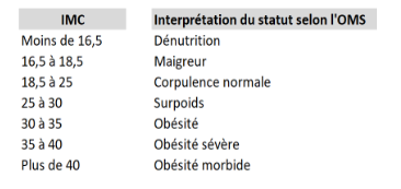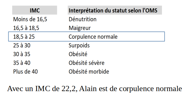 Alain a calculé son IMC (Indice de Masse Corporelle) à l’aide de la formule :