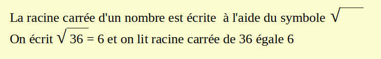 - La racine carrée de 36 est égale à 6 car 62 = 36