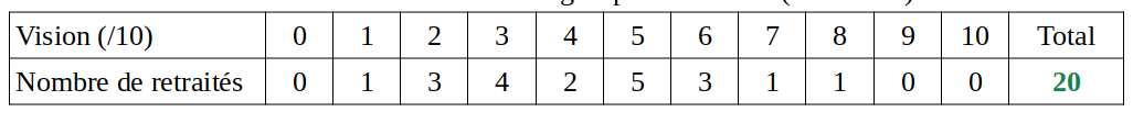 Les résultats d’un test de vision réalisé sur un groupe de retraités (veinards !) sont les suivants :