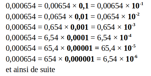 Quelques écritures possibles de 0,000654 en utilisant les puissances négatives de 10 :